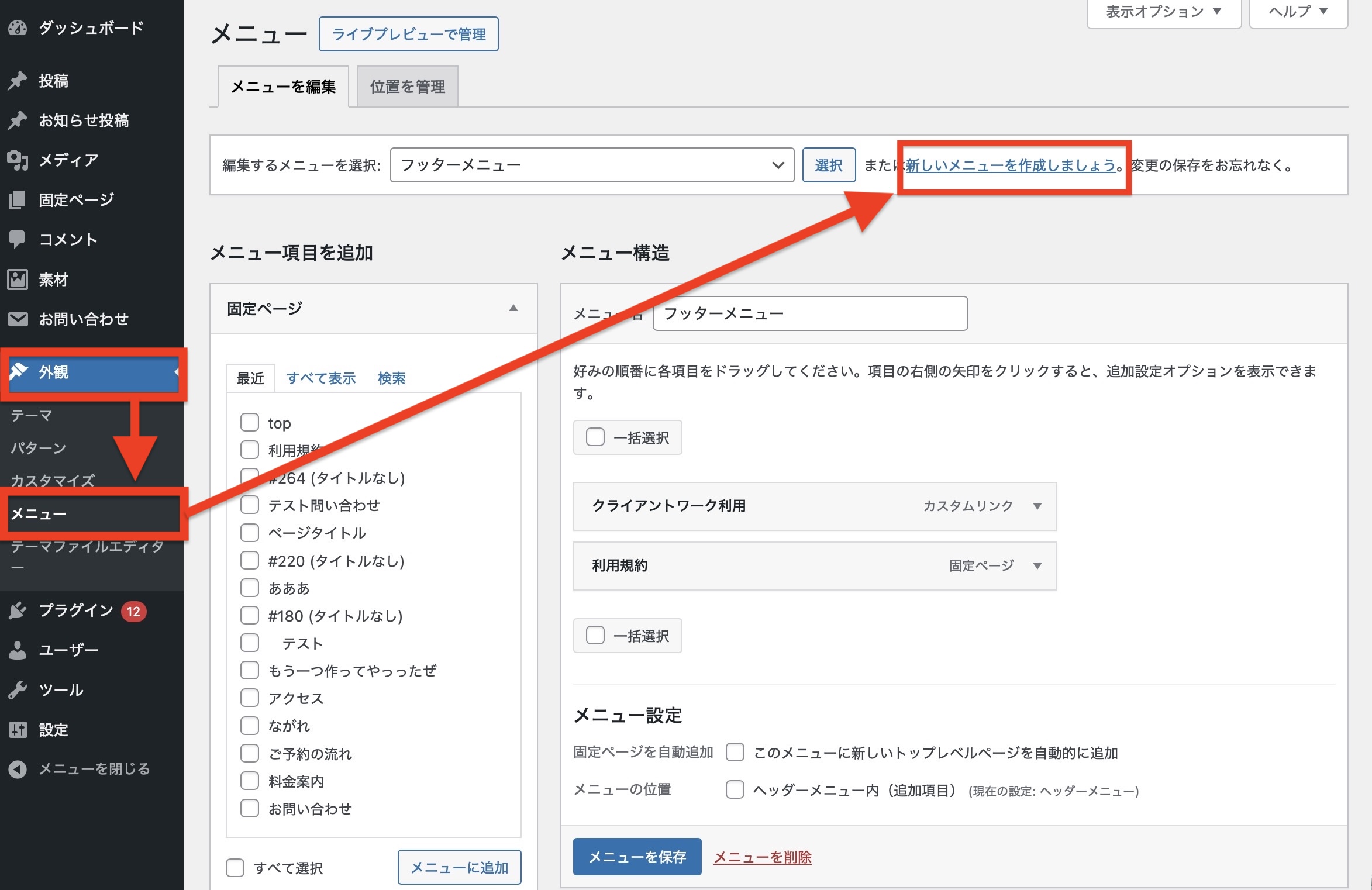2. WordPress標準のメニュー機能で自作メニューを新規作成する