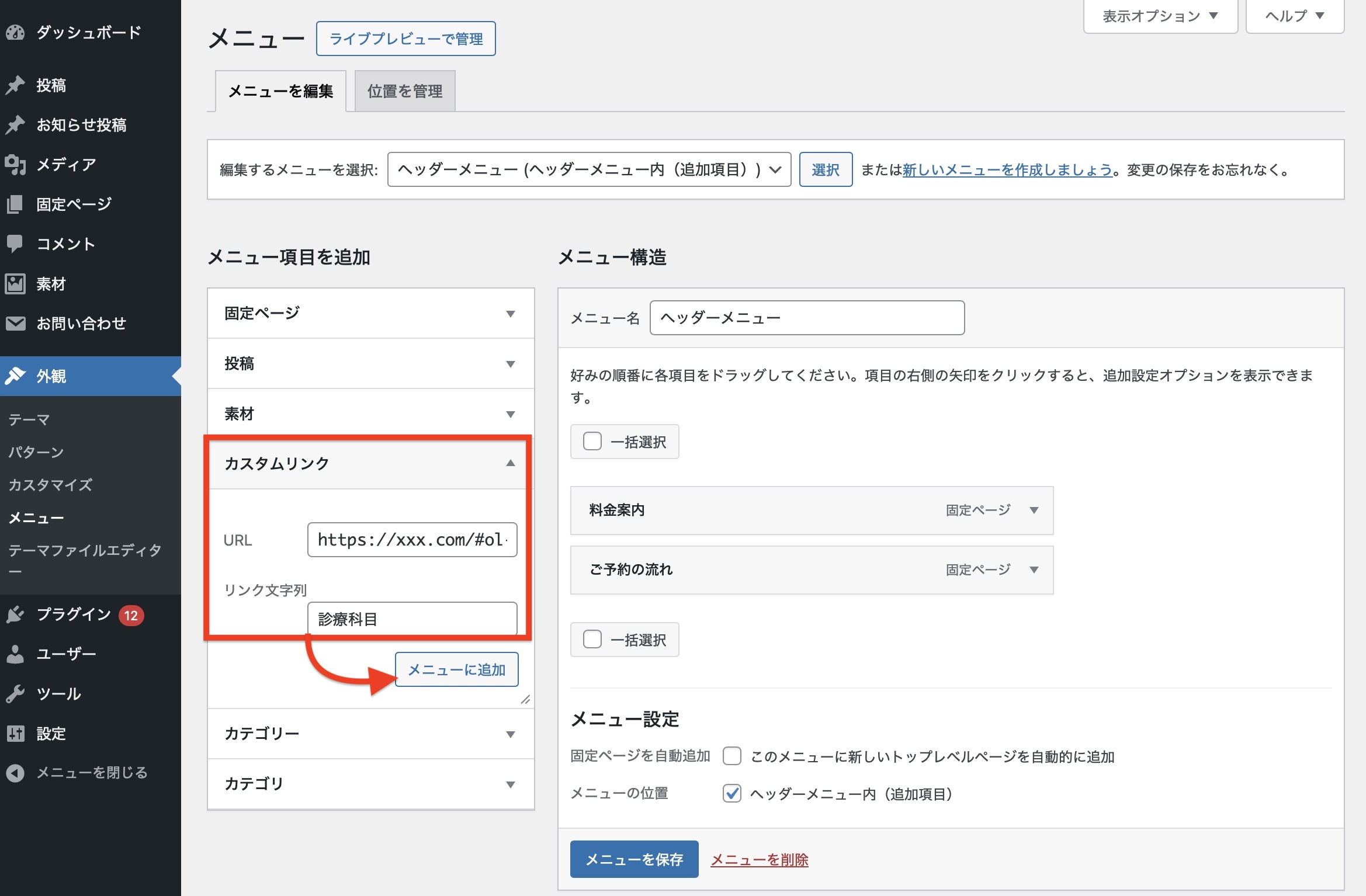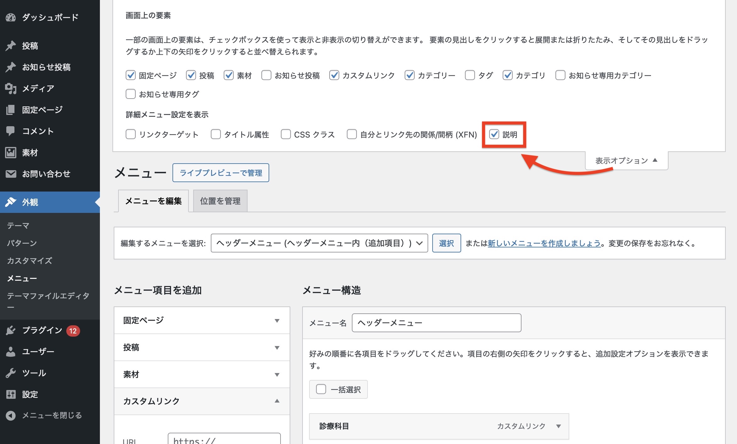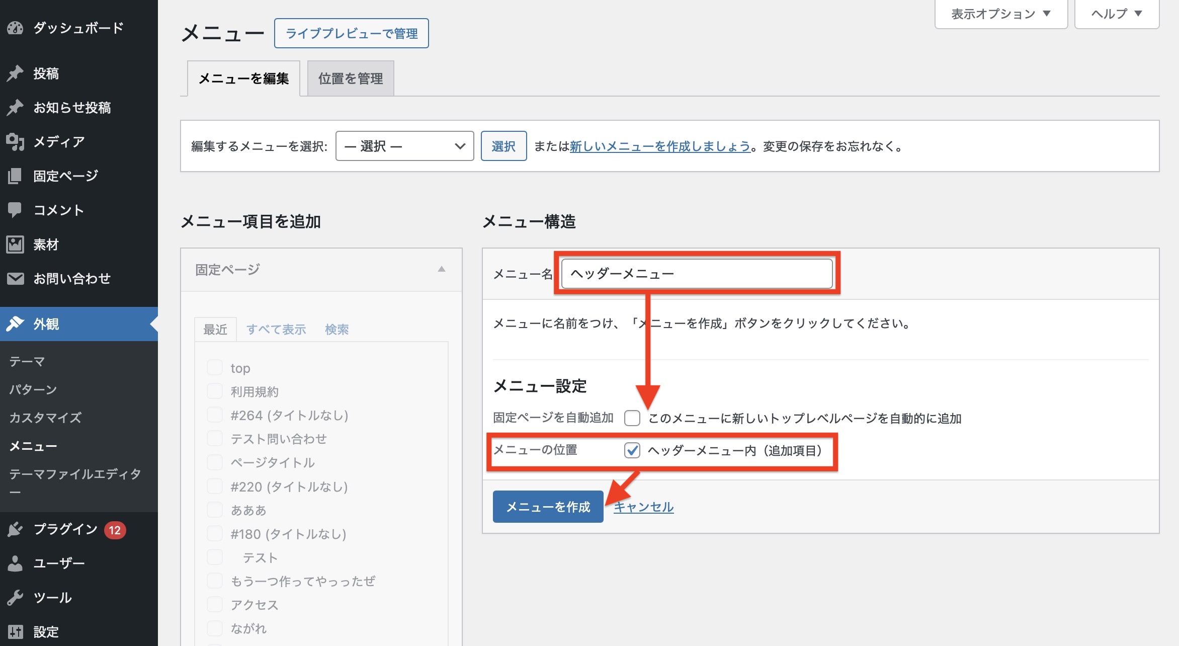 - メニューの位置:ヘッダーメニュー内(追加項目)にチェック