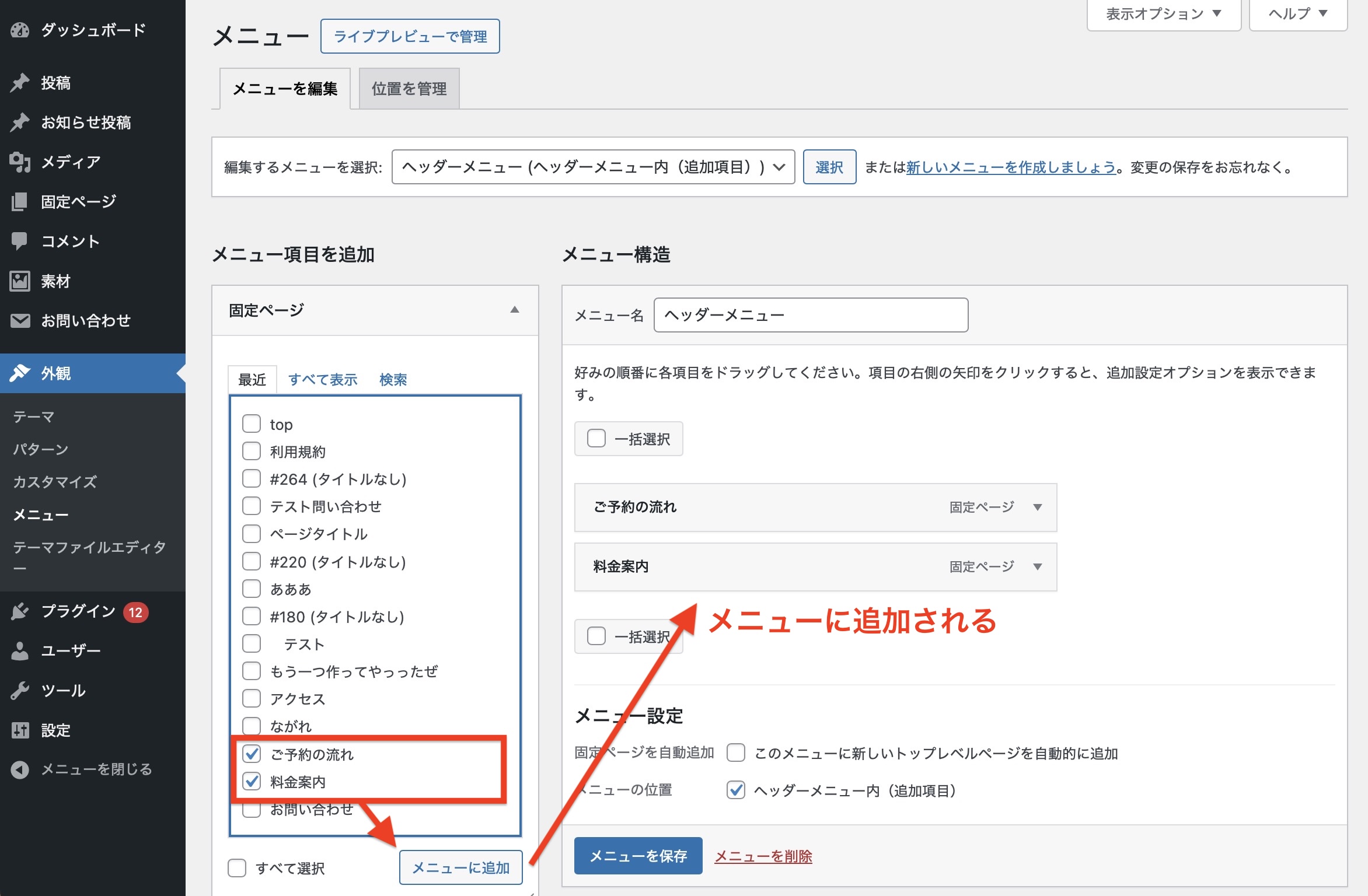 あとは左側のメニューから、固定ページへのリンク、投稿一覧へのリンク、外部サイトへのリンクなど、あなたのの表示したいメニューを選択して「メニューに追加」します。