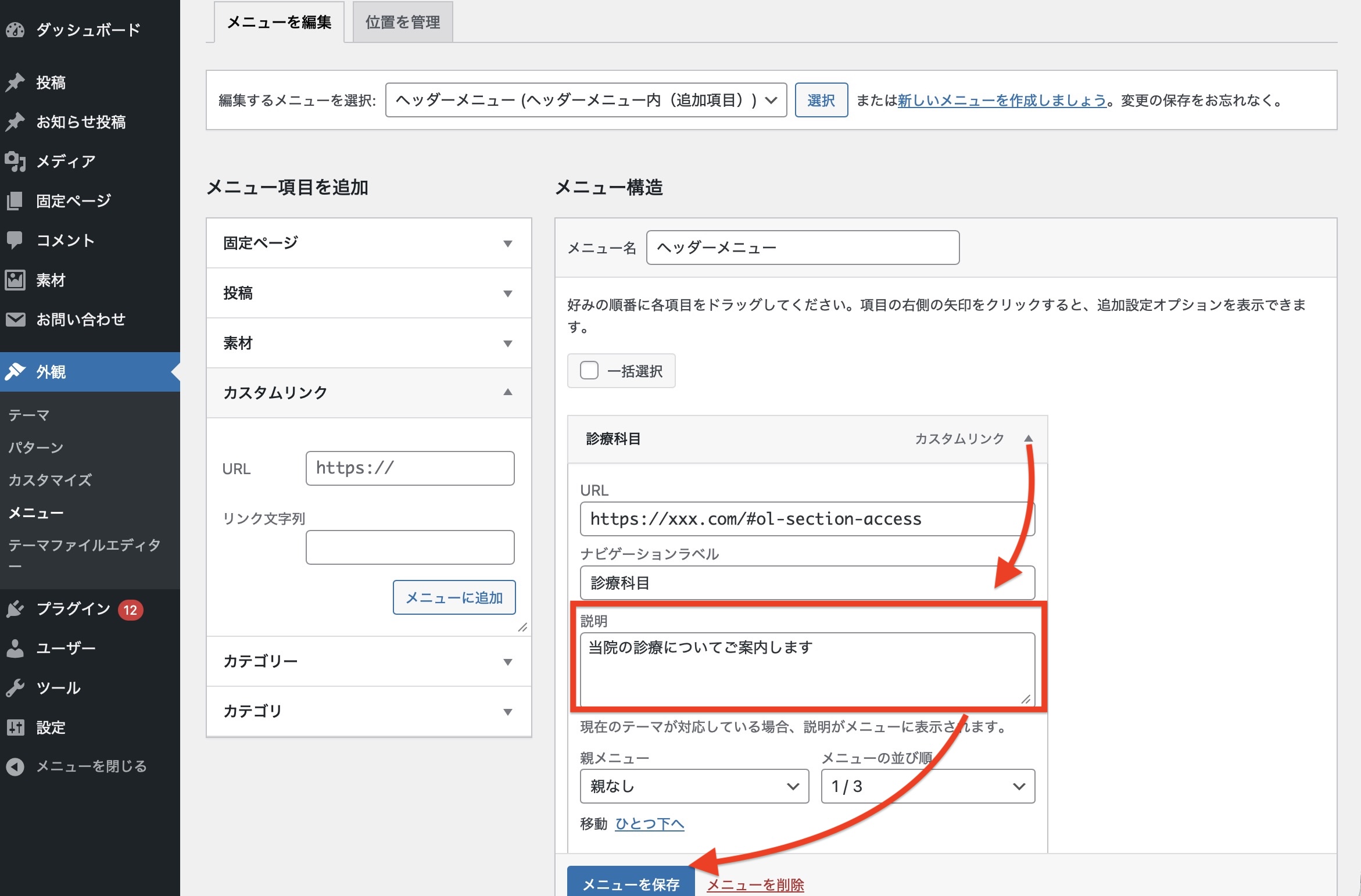 もし「メニューにリンクを追加する」がONのままだと、OLTANAの固定順メニューと自作メニューが両方表示されてしまい、順番の管理が少し複雑になります。