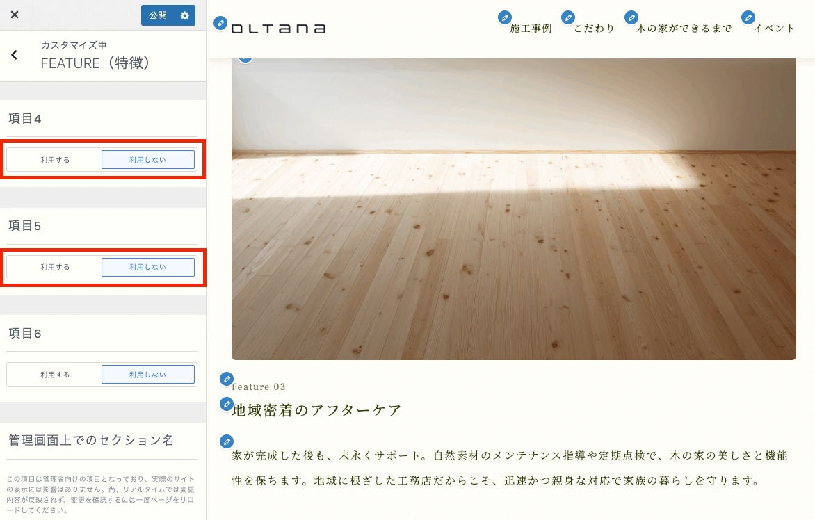 「利用設定」を「利用する」にすることで、FEATUREセクションが表示されます。このセクションが不要の場合、「利用しない」にすることで非表示にできます。